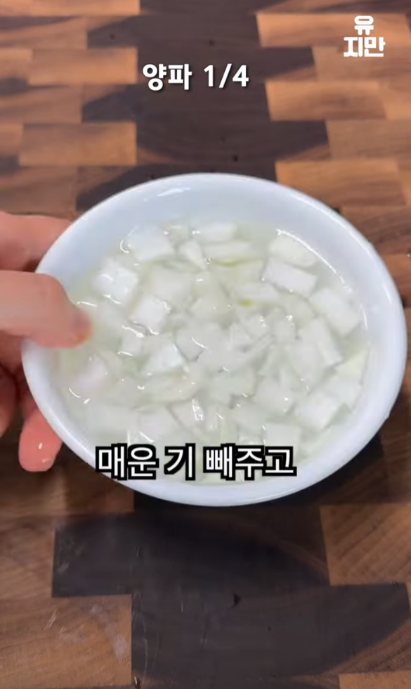 양파는 찬물에 10분 정도 담가서 매운 기를 빼줍니다. 이렇게 하면 양파의 향이 덜 진하고 상큼한 맛이 더해집니다.