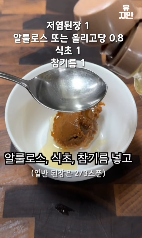 저염 된장 한 스푼, 알룰로스, 식초, 참기름을 섞어 매콤한 소스를 만듭니다.