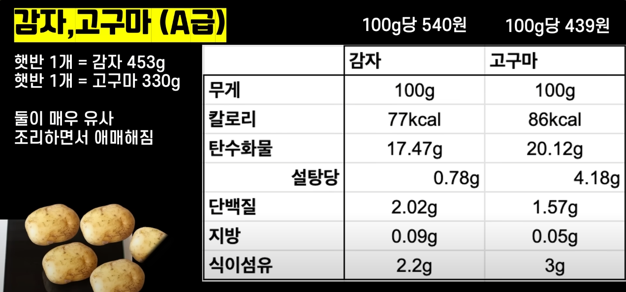 감자, 고구마, A급 감자, 고구마는 매우 유사합니다. 혈당지수 비교는 이전에 영상으로도 만들어 놨지만 조리 방법에 따라 달라지기 때문에 큰 의미가 없고 고구마의 당류가 조금 더 높은 편이라는 것만 알고 계시면 좋을 것 같습니다. 햇반 한 개 수준의 탄수화물을 섭취하려거든 요만한 감자를 4개만 드신다고 생각해 주시면 됩니다. 용량 계량하기도 편하고 식이섬유량도 높으면서 조리한 다음 밖에 들고 다니기도 편해서 매우 좋은 탄수화물이라고 생각합니다.