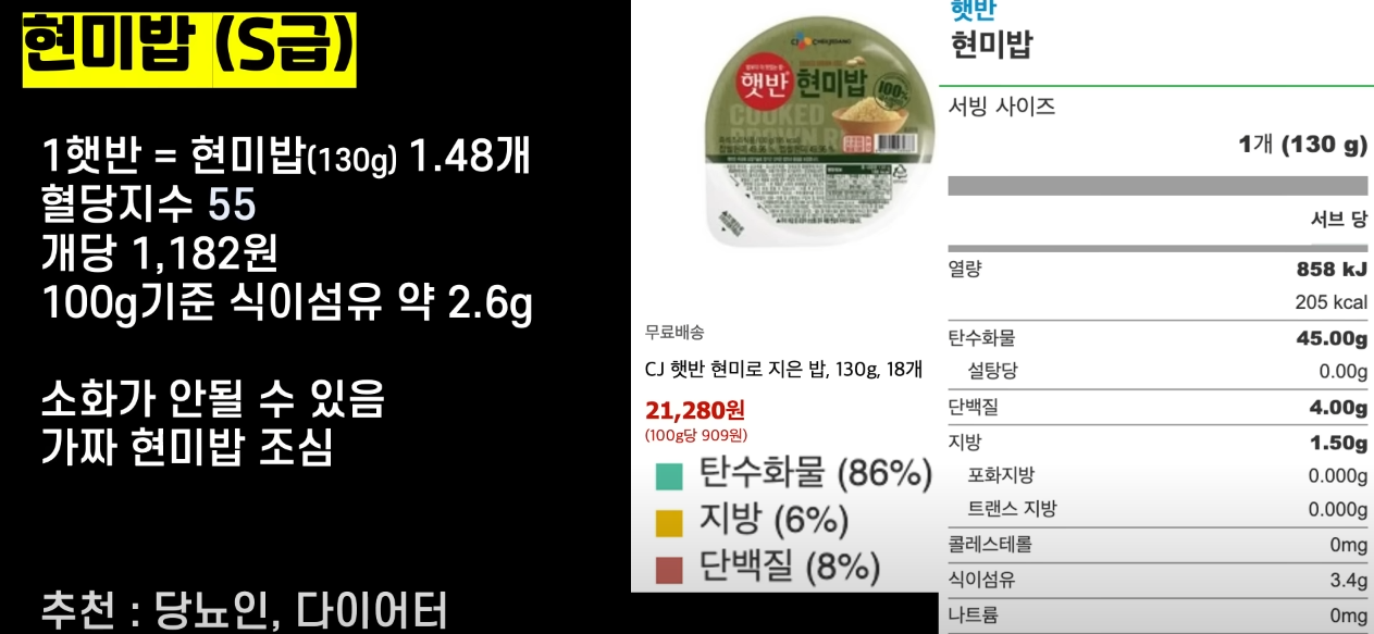 현미밥 S급, 방송에서 하도 떠돌아드는 현미밥입니다. 가격, 성분, 접근성 깔게 없는 S급이 맞습니다. 하지만 주의하셔야 할 점은 소화가 잘 안 될 수도 있다는 건데요. 이게 같은 쌀인데 현미는 백미보다 껍질을 덜 깎아내란 말이죠. 결국이 껍질을 함께 먹게 식이섬유를 섭취할 수 있고, 식이섬유는 물리적으로 소화가 안 되기 때문에 흡수가 느린 식사를 하게 되면서 건강에 좋다고 하는 겁니다.