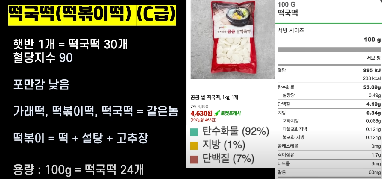 지방 함량도 낮고 당류도 꽤나 낮은 편입니다. 물론 쌀을 간 뒤에 꾹꾹 압착해서 만들었기 때문에 섭취 대비 포만감은 낮은 편입니다. 혈당 지수도 높아서 당뇨 있는 분들에게도 안 좋고요. 쉽게 예시로 들면 햇반 하나에 떡국떡 30개라고 생각하시면 됩니다. 우리 보통 설날에 떡국 먹을 때 60개 정도는 먹어야 배가 차지 않나요? 가래떡 떡볶이 떡, 떡볶이 떡 모두 같은 놈인데 생김새만 다르게 잘라놓은 거 아시죠. 떡볶이 같은 경우에는 위에 떡들에다 설탕이랑 고추장 풀어놓은 겁니다. 떡, 설탕, 고추장 모두 탄수화물이다 보니까 탄수화물 폭탄이라는 말이 여기서 나온 거겠죠. 떡국떡 30개 정도량이 떡볶이에다가 계란이나 닭가슴살 같은 단백질 좀 채워 드시면 일반인 기준으로 제법 괜찮은 부자가 됩니다. 물론 간식으로 드실만한 음식은 아닌 것 같습니다.