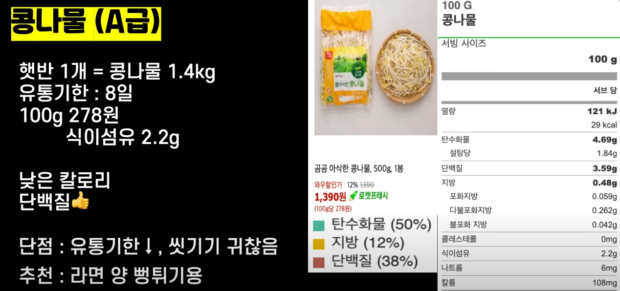 콩나물은 A급보시면 아시겠지만 단백질 비율이 되게 높은 편이고요, 식이섬유도 많기 때문에 콩나물로 햇반 하나의 탄수화물 양을 채우려면 무려 1.4kg를 드셔야 됩니다. 참고로 이 정도가 500g인데요, 칼로리는 거의 없다시피 하고 가격도 너무 쌉니다. 500g에 1,300원 밖에 안 합니다. 폭식하고 싶은 날 콩나물 드셔주시면 됩니다. 단점이랑 유통기한이 짧고 쉽게 귀찮다는 점이 있습니다.