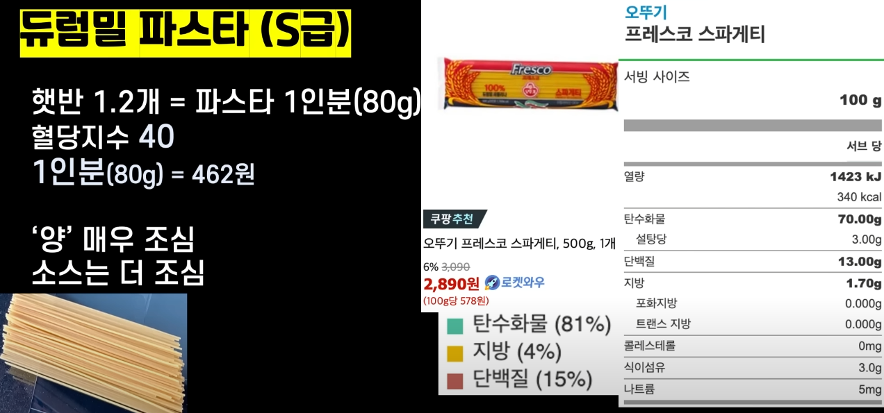 파스타, S급 가격과 탄단지 비율 보십시오. 최고의 탄수화물 0번입니다. 심지어 우리나라에서 유통되는 파스타는 듀럼밀이라고 해서 식이섬유가 높고 단단한 미를 사용했기 때문에 소화 흡수 속도가 느려서 혈당지수 또한 낮습니다. 어 그런데 100g의 탄수화물 70g이면 탄수화물 비중이 너무 높은 거 아니야?라고 하실 수 있지만