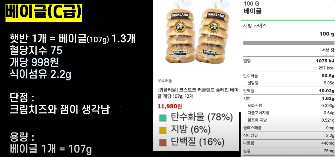 베이글 C급입니다. 베이글 한 피스에는 햇반 한 개 가까운 탄수화물이 들어있다고 보시면 됩니다. 간식으로 드시기에는 좀 헤비하다고 느껴지고, 아무리 식사를 하시더라도 한 개 이상은 드시지 않는 걸 추천드리고 싶습니다. 그리고 기본적으로 빵이기 때문에 소화 흡수도 빨라서 혈당지수도 높은 편이고요. 때문에 당뇨환자분들에게는 비추천이지만 빵을 좋아하신다면 식사 대용으로 강추드리고 싶습니다. 아침에 밥 대신 베이글 하나에 계란 프라이. 2개쯤에서 커피 한잔 하면 오늘은 나도 뉴요커입니다.