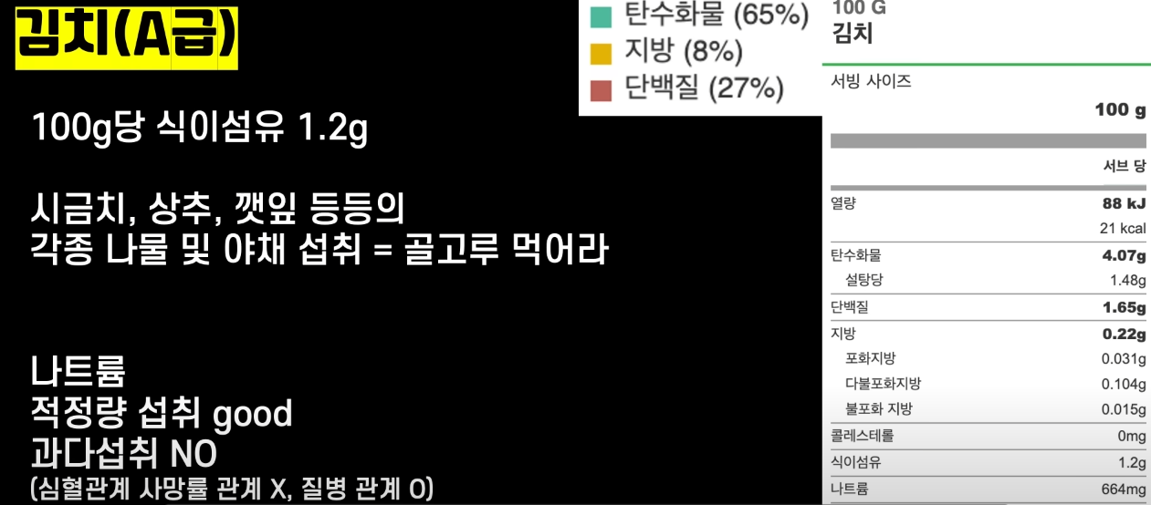 김치 A급, 맘 같아선 S급입니다. 소금은 칼로리가 없기 때문에 김치 자체가 칼로리가 거의 없다시피 합니다. 이건 김치를 구성하는 대부분이 식이섬유라 그렇습니다. 뭐 김치 뿐만이 아니라 시금치, 상추, 깻잎 등등 각종 원료들은 대부분 칼로리가 없다고 보시면 됩니다. 많이 드셔도... 좋습니다. 문제는 나트륨인데요. 일일 나트륨 권장량 2000mg인데 김치 몇 조각 집어먹으면 이게 다 차버리기 때문에 양만 조금 조심해 주시면 됩니다.