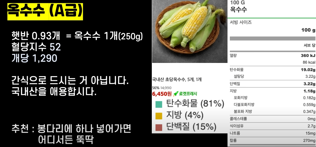 옥수수, A급. 각종 비타민과 무기질 폭발하고 국내산인데다가 가격도 싸고 집에서 삶아놨다가 봉지 하나씩 넣어놓고 들고 다니기 매우 좋은 간편식입니다. 다만 옥수수의 중간 크기 하나가 250g 정도 되는데, 탄수화물 약 70g 정도이기 때문에 간식으로 드시기에는 과하지 않나 싶습니다. 물론 운동하는 분들이라면 마음 놓고 드셔주시면 됩니다. 저 같은 경우에는 이렇게 조리돼서 개별 포장된 애를 먹는데 비싸기도 하고.. 중국산이지만 옥수수 삶는 게 너무 귀찮아서 안 먹고 다니다가 밖에서 이상한 거 주워 먹게 되더라고요. 매일 드시길 추천드리고 싶습니다.