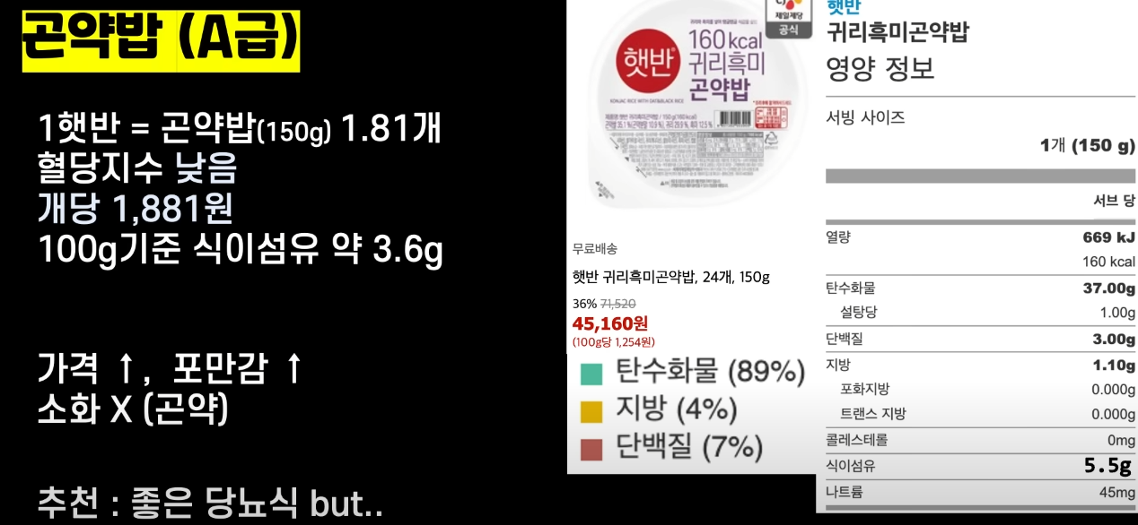 곤약밥 A급, 이것도 현미밥이랑 개념이 비슷합니다. 곤약도 물리적으로 소화가 안 되는 식이섬유이기 때문에 소화 속도가 느려지면서 혈당 조절에도 좋습니다. 다만 이것도 소화기관 안 좋은 분들은 복통을 일으킬 수 있겠죠.