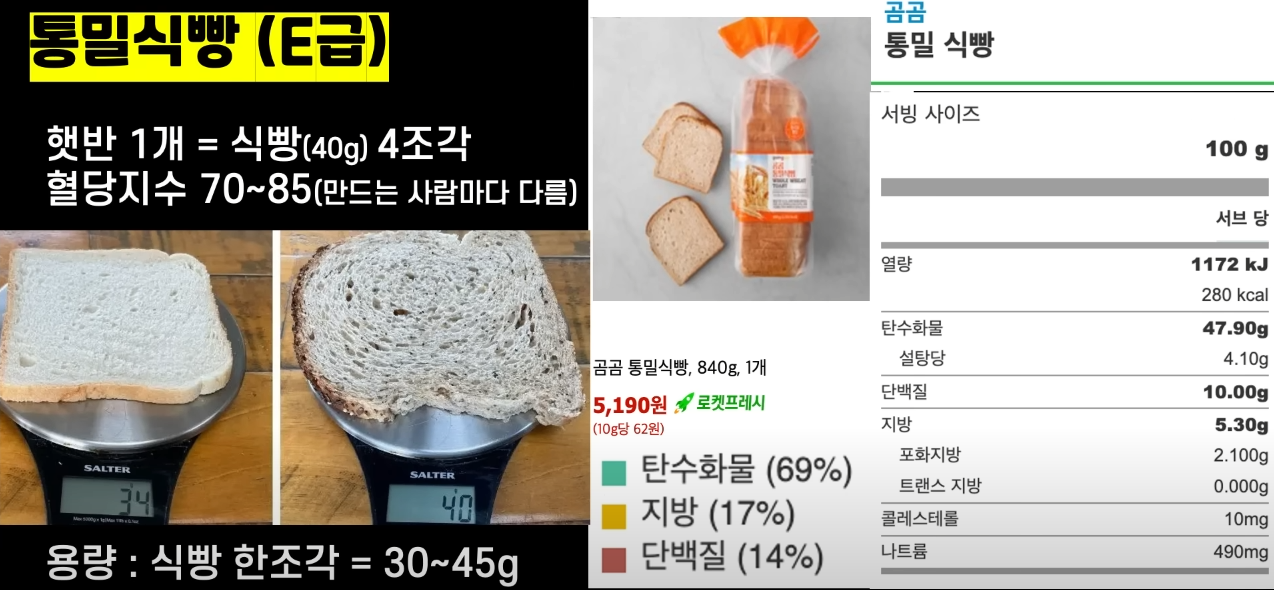 식빵, E급입니다. 식빵 4조각을 드시면 햇반 한개 드시는 양의 탄수화물을 섭취하실 수 있습니다. 물론 지방 섭취를 더 많이 섭취하시게 되시겠지만요. 말씀드리고 싶은 부분은 통밀빵, 통밀식빵 모두 혈당 관리에서는 좋지 않다는 겁니다. 우리나라에서 유통되는 대부분의 통밀류 가공품들은 식이섬유가 함유되어 있지 않습니다. 그냥 식빵이라고 생각하고 드셔주셔야 합니다.