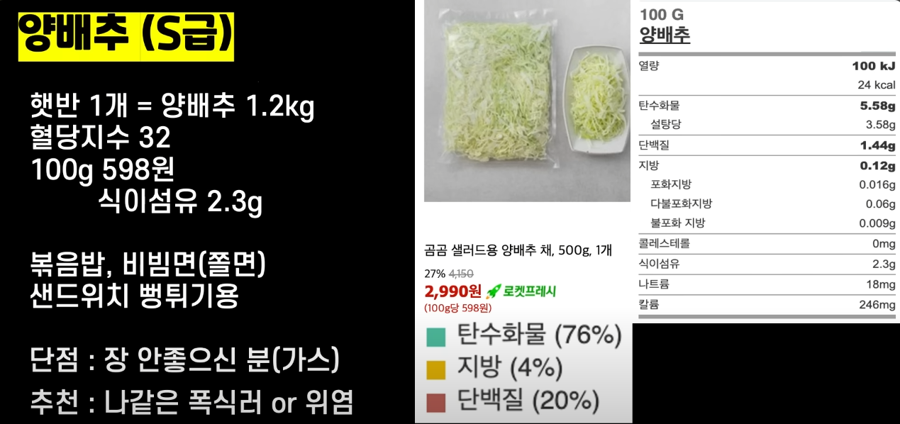 양배추는 S급입니다. 집에 하나씩 꼭대기에 두십시오. 어떤 음식을 드시고간에 양배추 100g을 곁들여 드시면 최고의 식단이 완성됩니다. 가격도 싸니까 이건 무조건 냉장고에 넣어두십시오. 단점이라면 채로 손질되어 있는 녀석을 사면 편하긴 한데 며칠만 지나도 갈변된다는 단점이 있으니까 갈변되기 전에 잽싸게 섭취하는 건강한 방법을 쓰시던가 지퍼백으로 공기를 빼서 보관하는 것을 추천드리고 싶습니다.