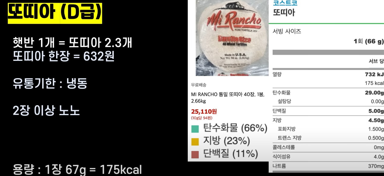 또띠아 D급. 또띠아가 얇아서 심리적으로 칼로리가 낮을 것 같지만 그렇지 않습니다. 물론 또 뛰어만 집어 드시는 분은 없을 거기 때문에 추가적으로 섭취하시게 된 속재료들을 고려해서 드시는 게 좋습니다.