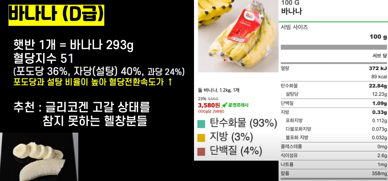 바나나 D급. 중간 크기 바나나 약 3개 정도가 햇반 하나 정도의 물량입니다. 맛에서 단맛이 넘치는 만큼 당류가 높습니다. 사실 당뇨 얘기를 조금 더 하고 싶지만 과일은 천연 과장이라서 괜찮다 아니다로 의견이 갈리고 있기 때문에 우리는 그냥 과일은 당류가 높으니까 식사 대용으로 좋고 디저트로는 조심하자 정도로 생각해 주시면 좋을 것 같습니다.