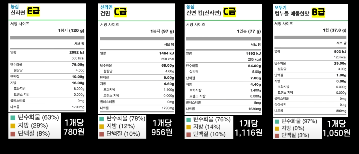 이쯤에서 라면 한번 정리해보겠습니다. 봉지 라면 하나에 탄수화물이 79g 들어 있습니다. 라면 자체가 밀가루를 튀겨 끓여 먹는 것이기 때문에 지방량도 꽤나 높습니다. 때문에 국물에 둥둥 뜨니까 조심해 주셔야 되겠죠? 그리고 단백질 함량이 낮으니까 계란이나 닭가슴살 같은 단백질 구분을 꼭 곁들여서 드셔 주시길 권해드리고 싶습니다. 제가 추천드리는 건 신라면 겉면인데요, 튀기지 않고 건조했기 때문에 지방량이 획기적으로 낮습니다. 그런데 겉면 자체가 기본적으로 양이 작아서 끓이는 김에 두 개씩은 끓이게 되더라고요. 양만 좀 줄여서 컵으로 내놓은 버전이 있고, 탄단지 비율은 얼추 비슷합니다. 대신 가격이 올라갑니다. 라면 업체들이 가격 선정을 되게 잘하는 거 같습니다. 제 최애는 컵 누들인데요, 오독오독 씹히는 게 맛이 좋습니다.