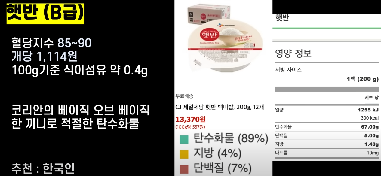 백미 햇반 B급, 200g짜리 햇반 하나에 탄수화물은 67그램들을 혈당지수는 85입니다. 혈당 지수가 높을수록 소화가 빨라서 체내 혈당을 빠르게 올리는 놈들이기 때문에 혈당 지수가 낮은 놈들 위주로 드셔주시는 편이 낫겠죠.