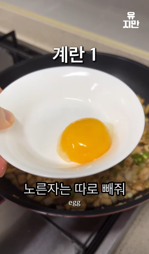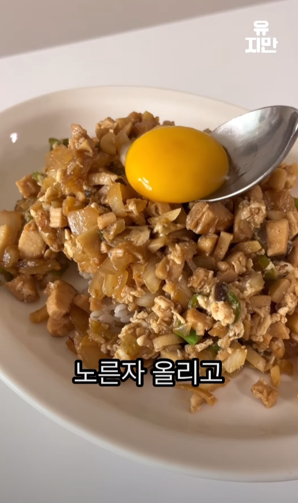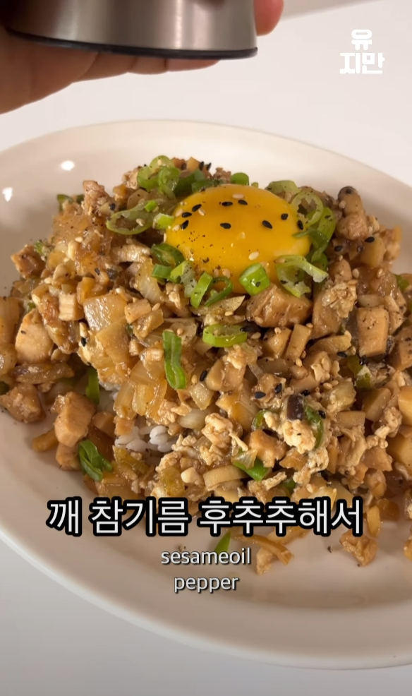 다 익은 요리를 밥 위에 올리고, 마지막으로 계란 노른자, 깨, 참기름, 후추를 뿌려 마무리합니다.