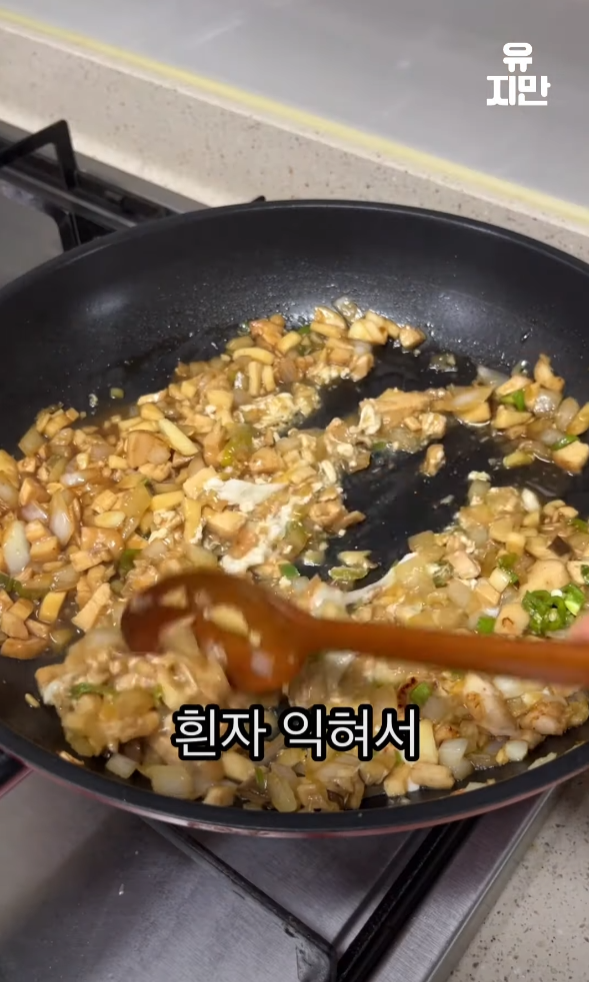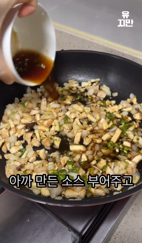 재료들이 노릇노릇하게 익으면, 만들어둔 소스를 부어준 후 계란 흰자를 넣고 익힙니다.
