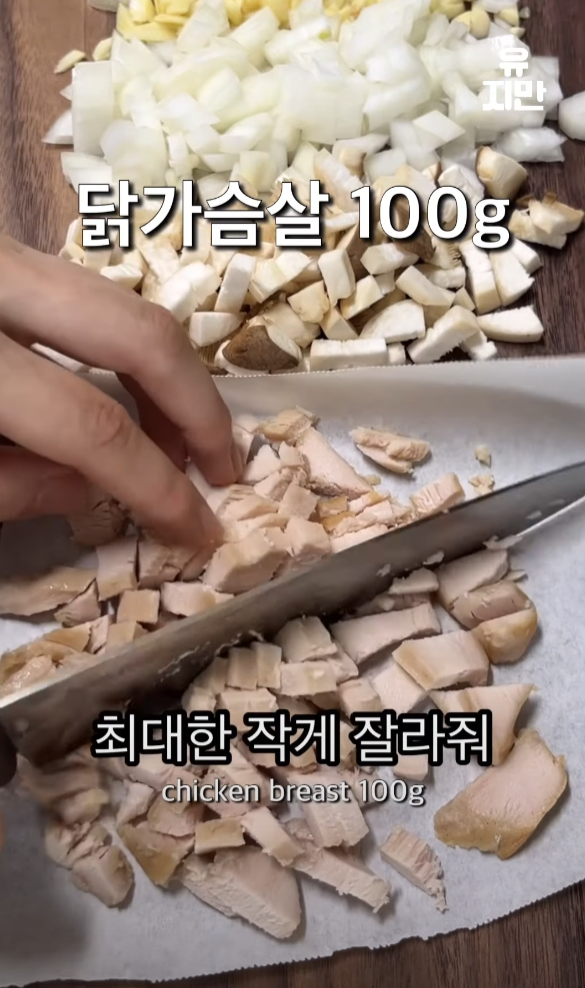 양파 반 개와 집에 있는 버섯 아무거나 적당하게 자르고, 닭가슴살도 최대한 작게 썰어 줍니다.