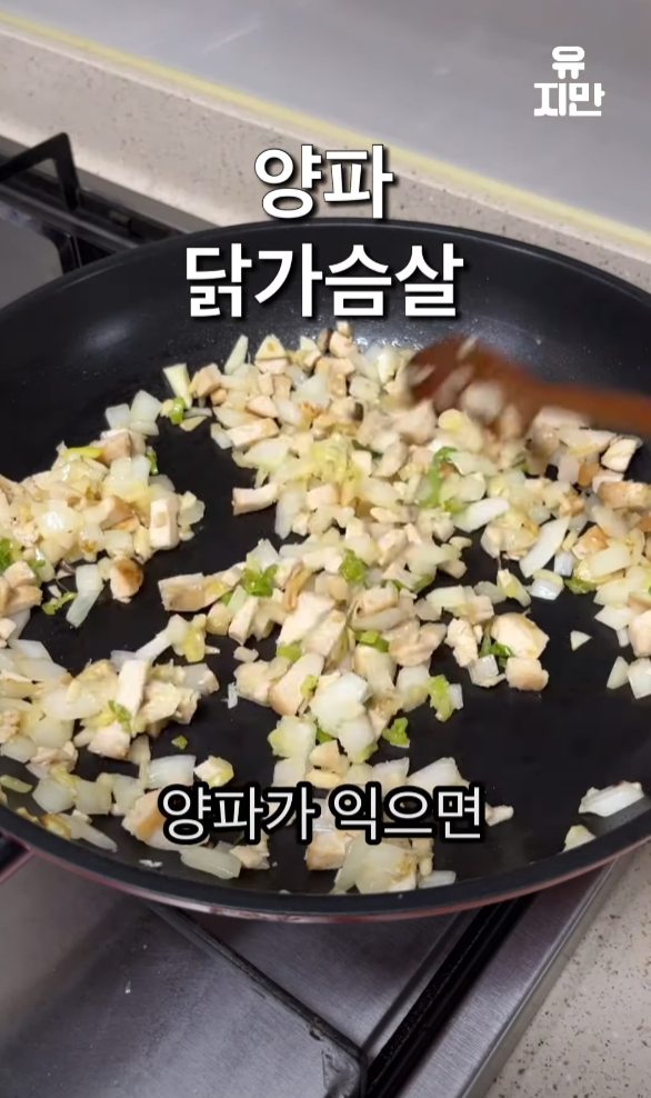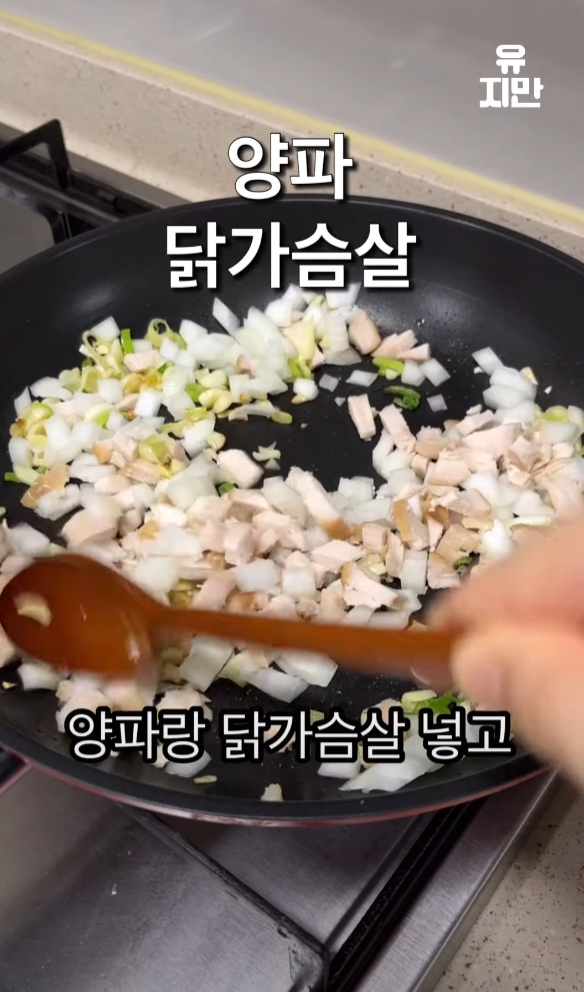 팬에 올리브유와 다진 마늘을 넣고 볶은 후, 익으면 양파와 닭가슴살을 넣고,