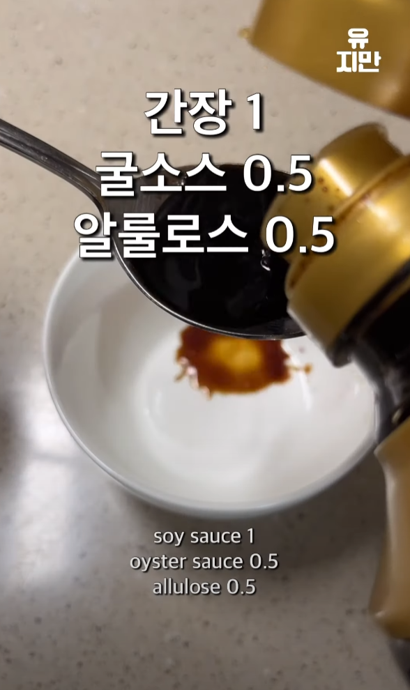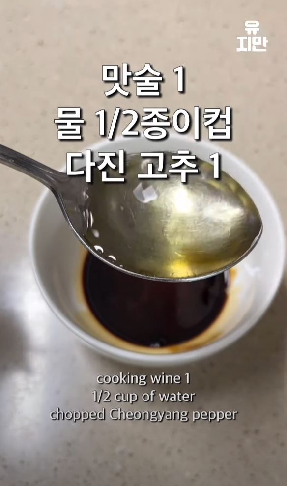 간장 한 스푼, 굴소스 반 스푼, 알룰로스 반 스푼, 맛술 한 스푼, 물 반 컵, 다진 고추를 섞어 소스를 만들어줍니다.