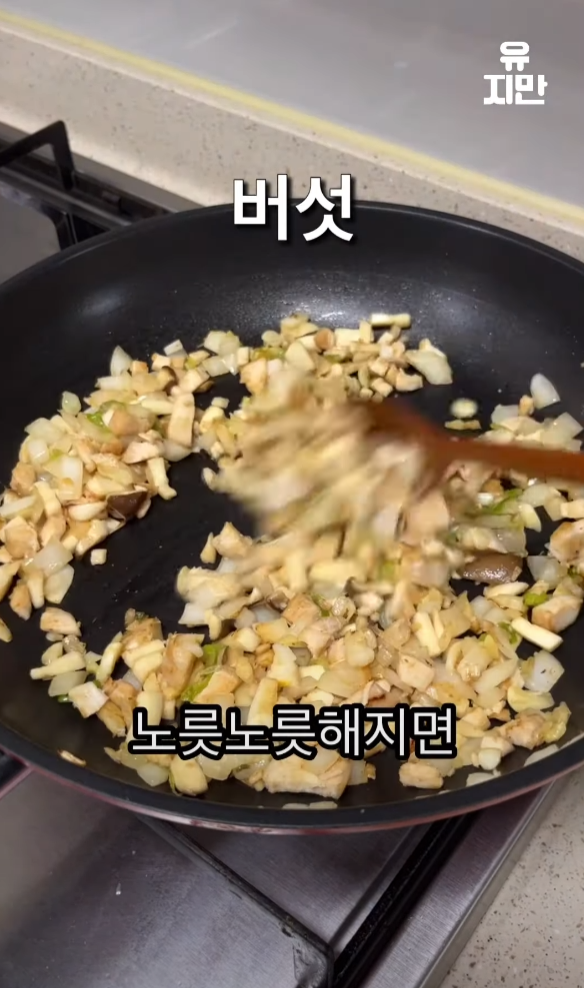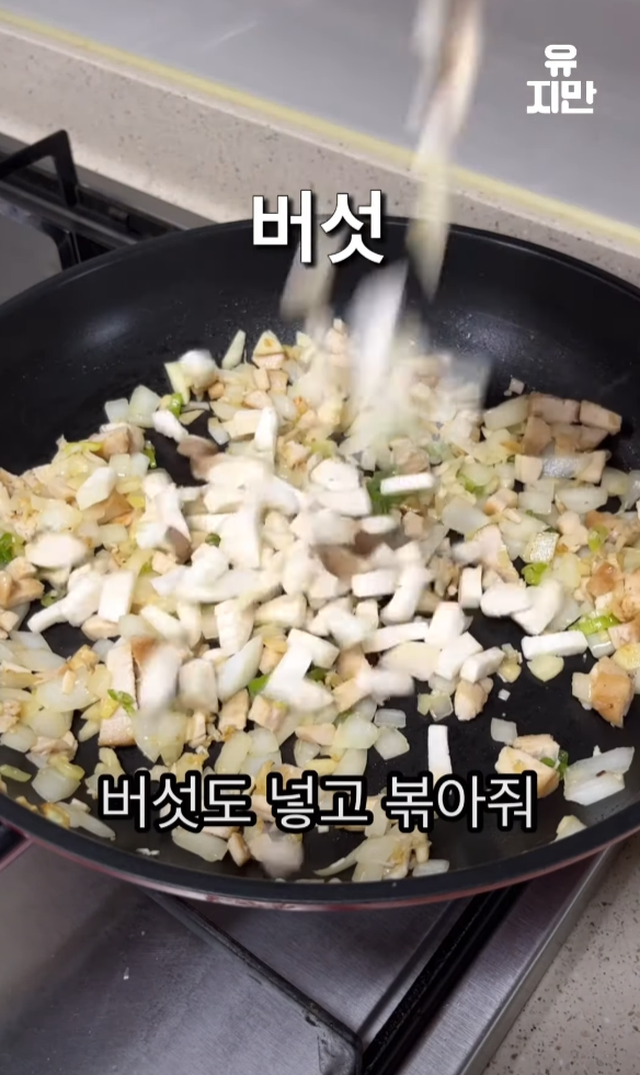 양파가 익으면 버섯도 넣고 함께 볶습니다.