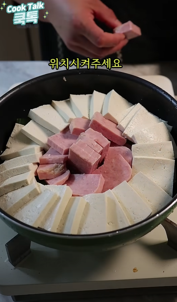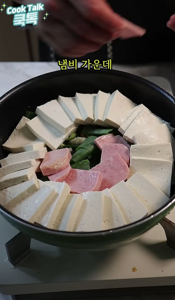 3. 작은 스팸 두 개를 먹기 좋은 크기로 썰어 냄비 가운데에 넣는다.