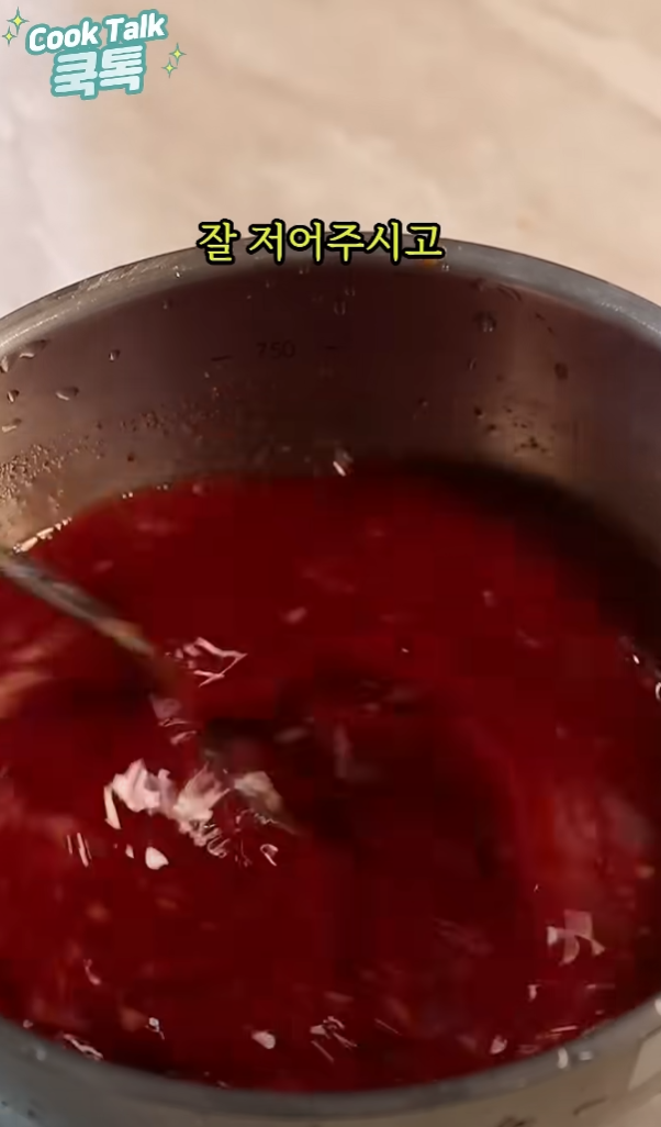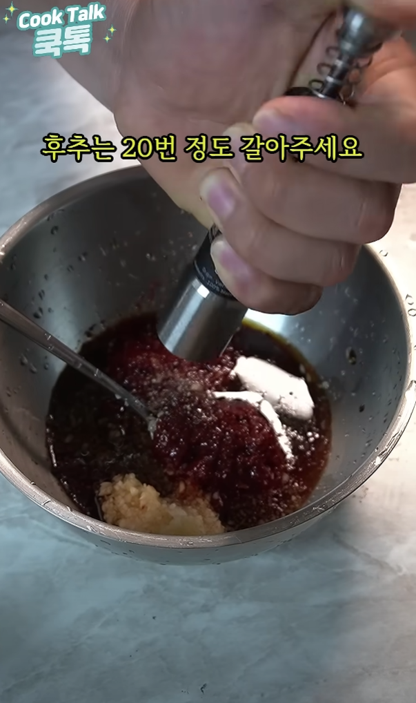 4. 양념장은 간장 세 스푼, 매실액 두 스푼, 고추장 한 스푼, 고춧가루 두 스푼, 간 마늘 한 스푼, 맛솔 두 스푼, 참치액 두 스푼을 섞어 만든다.