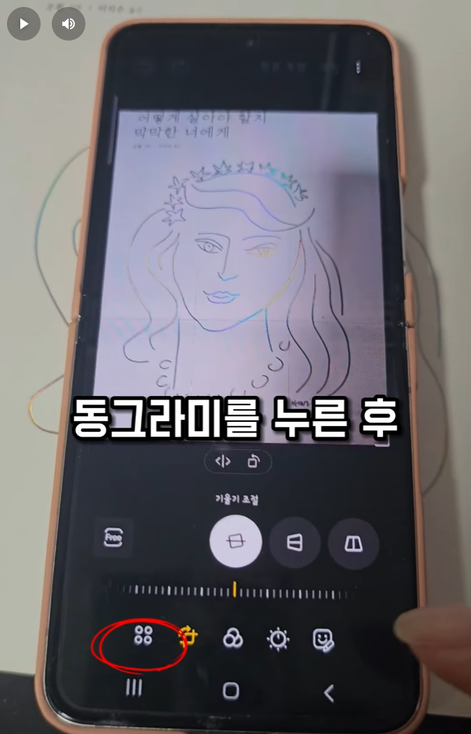 사진 편집 시 갤러리에서 연필 모양을 누르고 하단 맨 왼쪽 동그라미를 선택한 후,