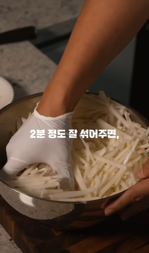 볼에 무채 넣고 설탕 4스푼, 꽃소금 반스푼 넣어 잘 섞어주세요.