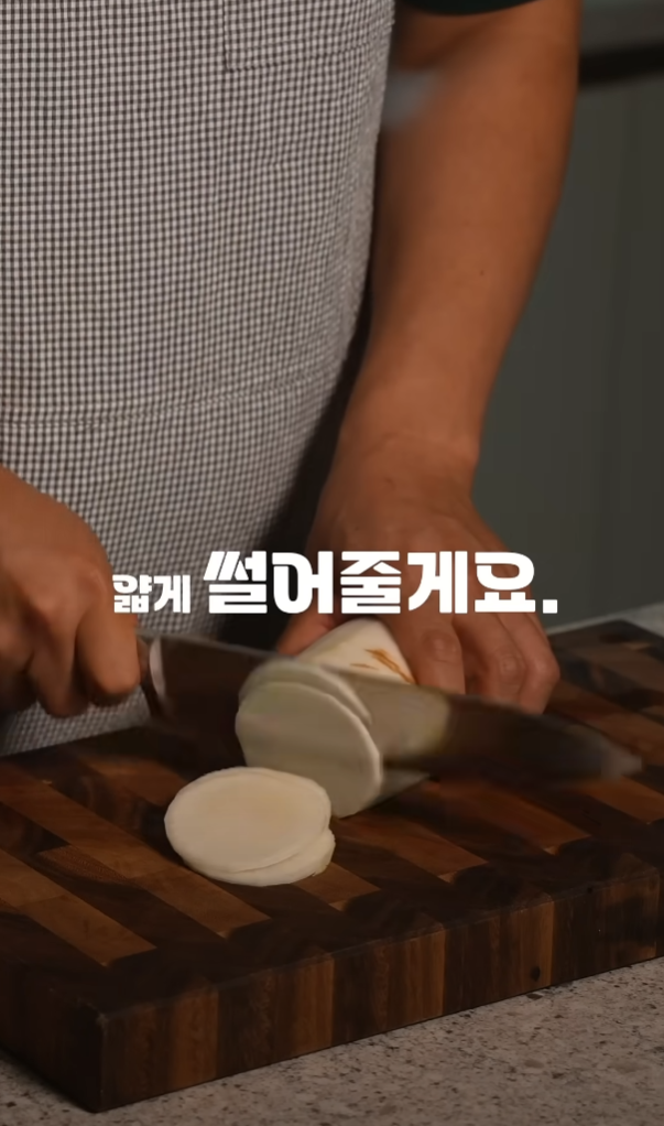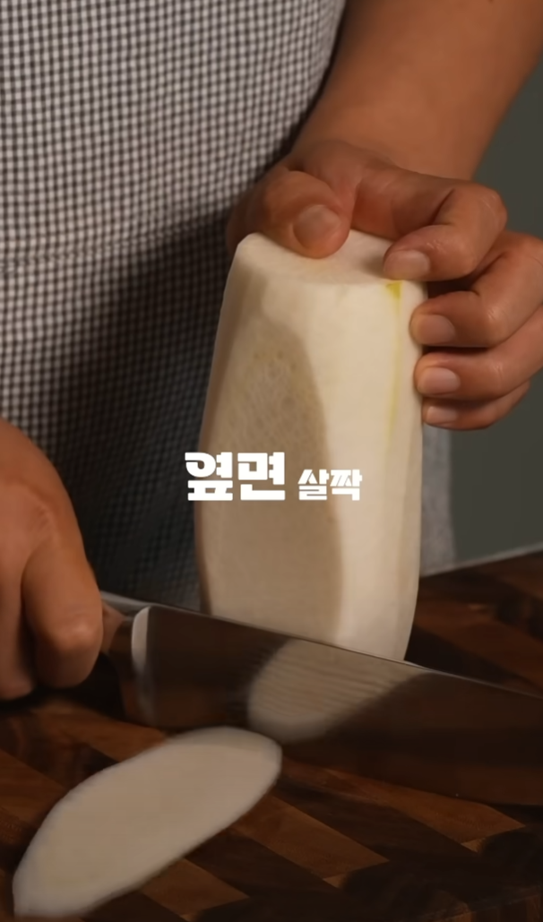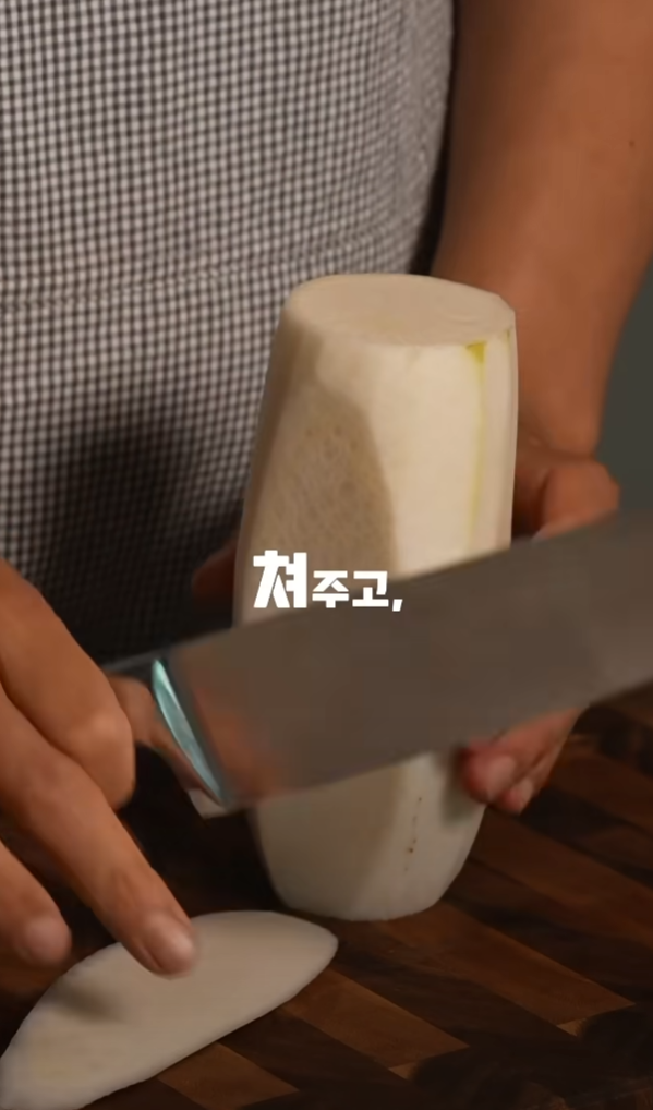 살짝 쳐주고 얇게 썰어 줄게요. 채칼보단 칼로 썰어야 무채가 물러지지 않아요.