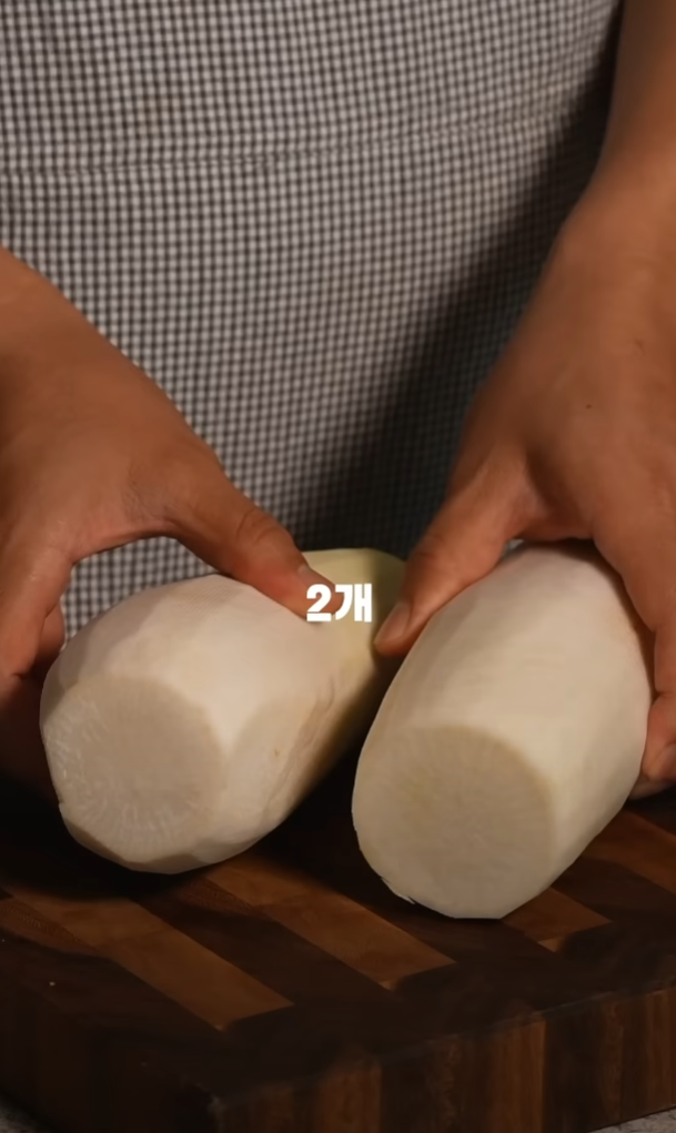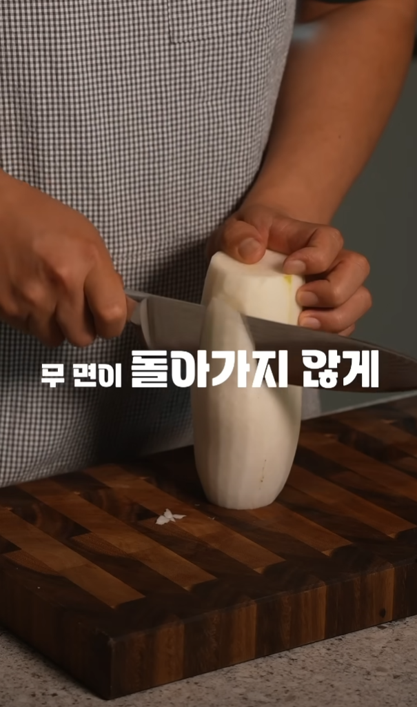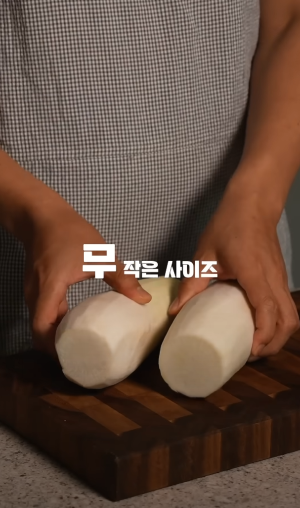 무 작은 사이즈 두 개를 준비하고, 채썰기 위해 옆면을 살짝 쳐서 고정한다.