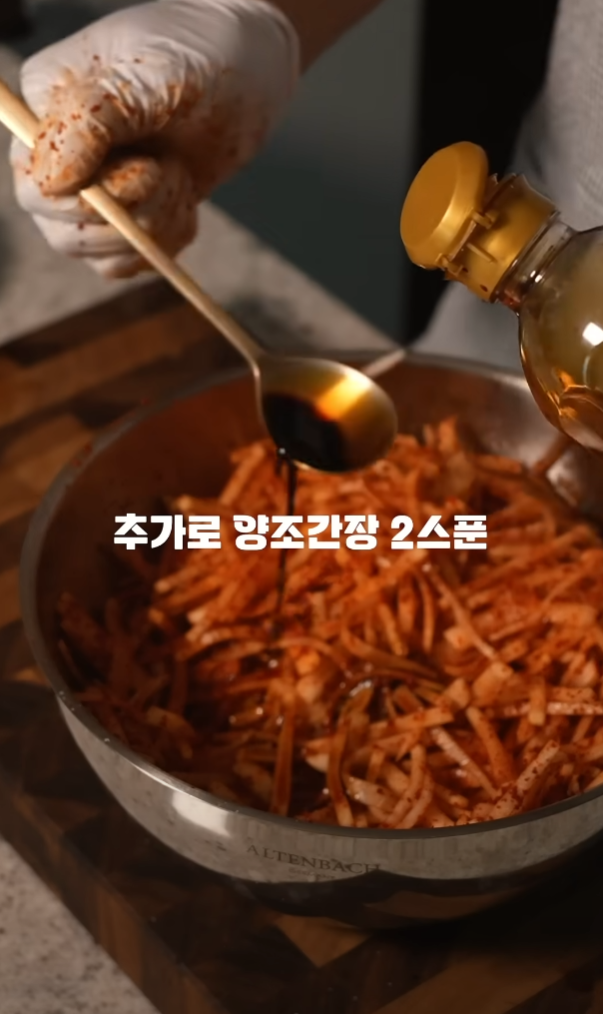 고춧가루 5스푼을 추가로 넣고 한 번 더 잘 버무린다. 그리고 양조간장 2스푼과 멸치액젓 1스푼을 넣어 맛을 더한다.