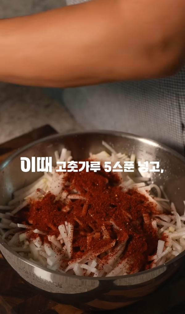 이때 고춧가루 5스푼 넣고 잘 한번 더 버무려 주세요.
