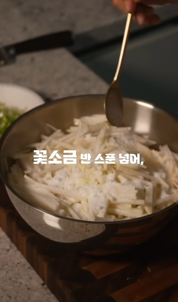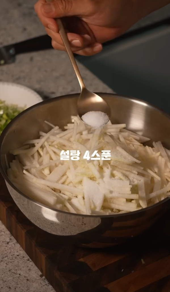 볼에 무채 넣고 설탕 4스푼, 꽃소금 반스푼 넣어 잘 섞어주세요.