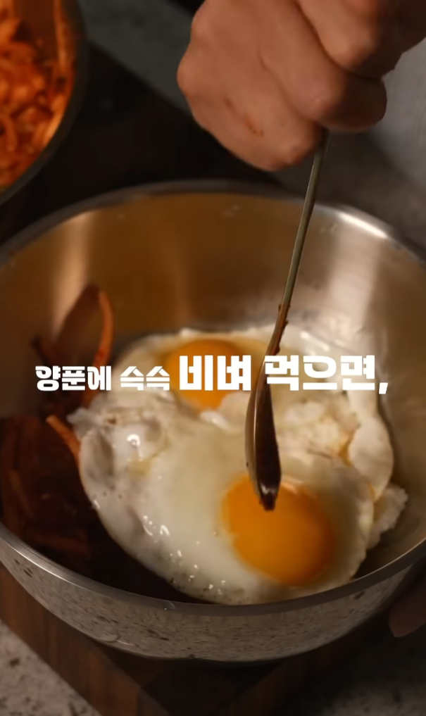 완성된 무생채를 흰밥 위에 올리고, 고추장 반 스푼과 계란 노른자 하나를 추가해 쓱쓱 비벼 먹는 것이 포인트입니다.