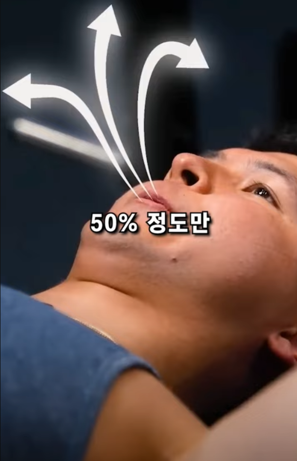 바벨을 대각선 방향으로 올리면서 숨을 50% 정도만 내뱉고 반복한다