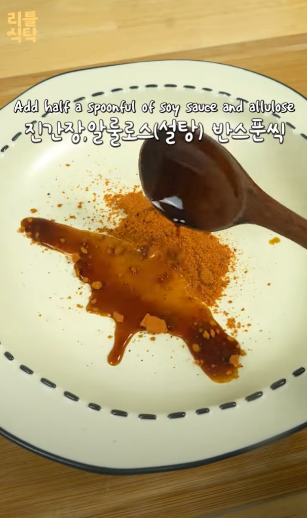 2. 진간장과 알룰로스를 각각 반 스푼씩 넣는다.