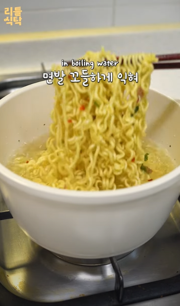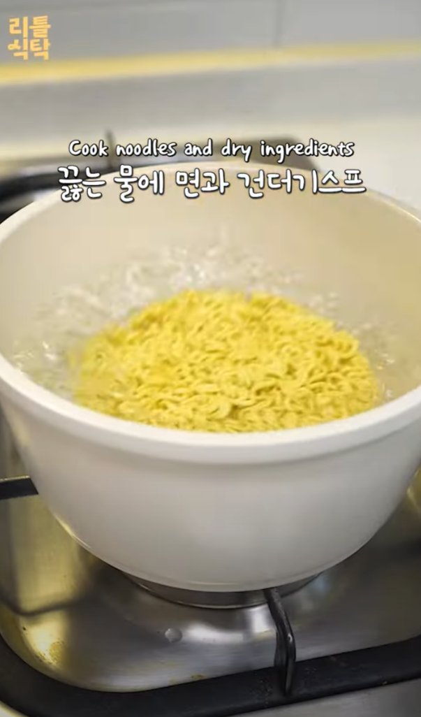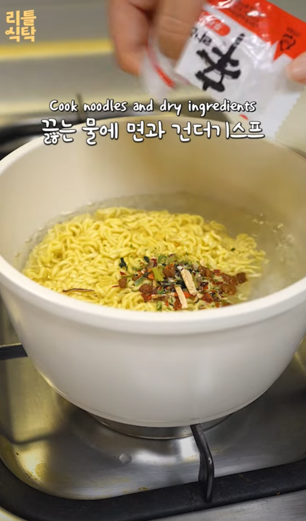 4. 끓는 물에 면과 건더기 수프를 넣고 면발이 꼬들하게 익힐 때까지 조리한다.