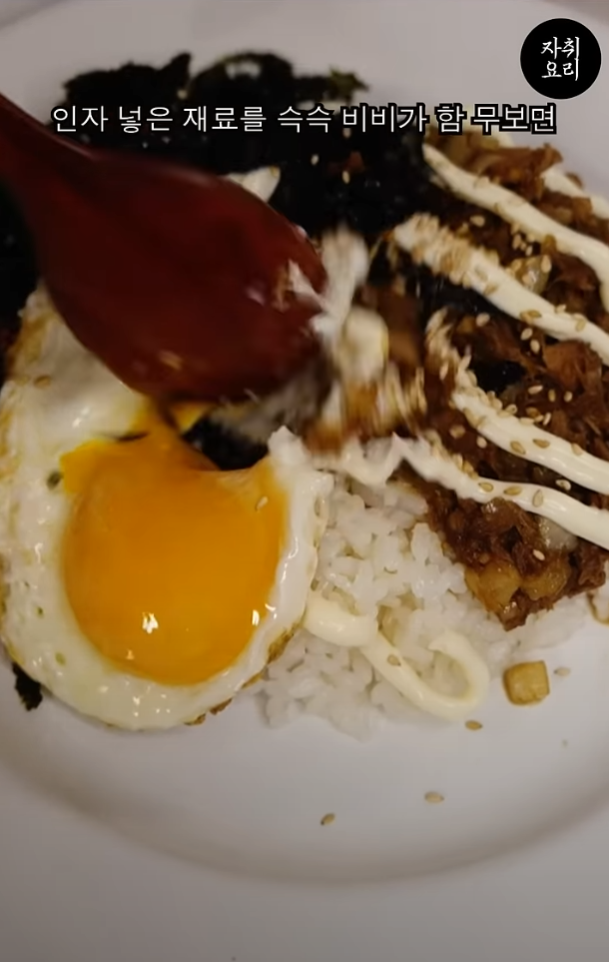 기름과 참치, 양파, 간장, 설탕을 활용해 풍부한 맛을 낼 수 있는 방법을 설명하며, 마무리로 계란 프라이를 얹어 완성하는 방법까지.