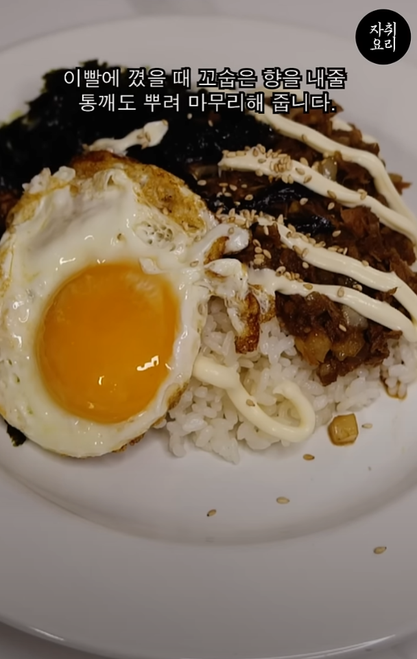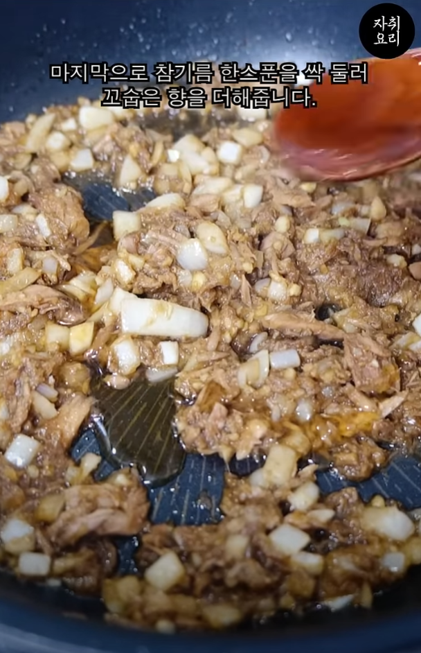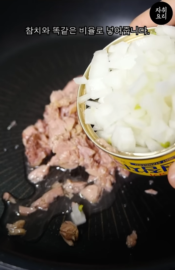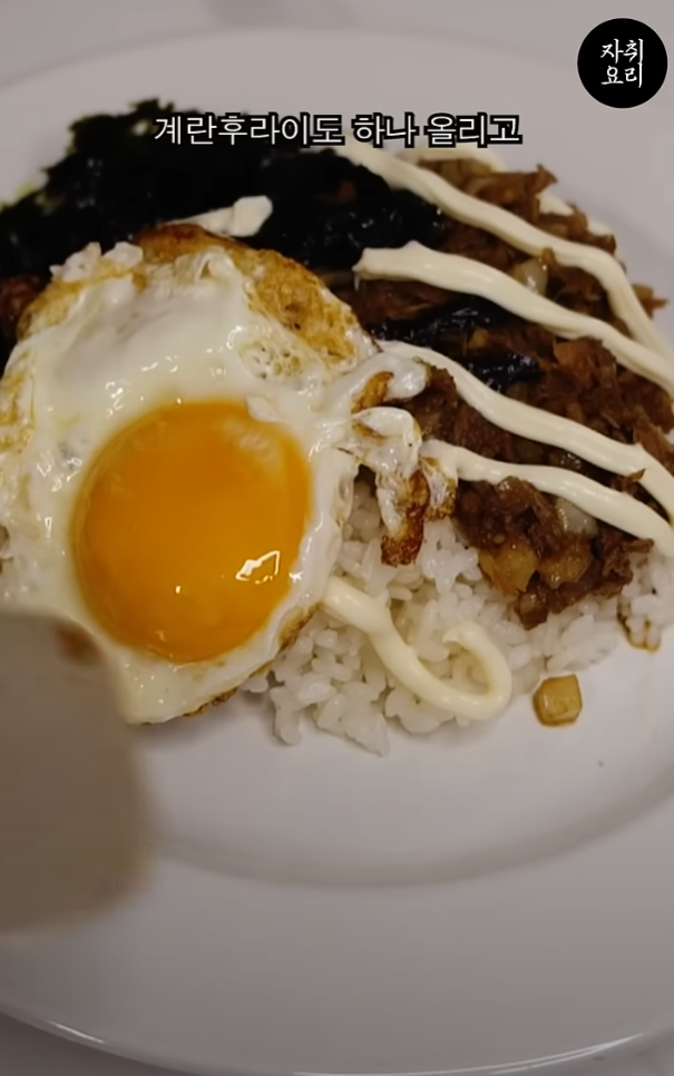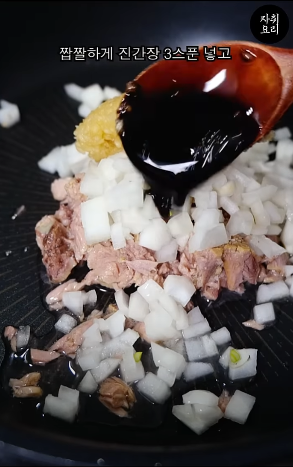 기름과 참치, 양파, 간장, 설탕을 활용해 풍부한 맛을 낼 수 있는 방법을 설명하며, 마무리로 계란 프라이를 얹어 완성하는 방법까지.