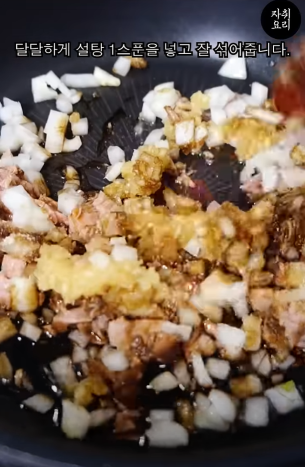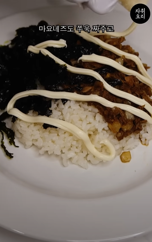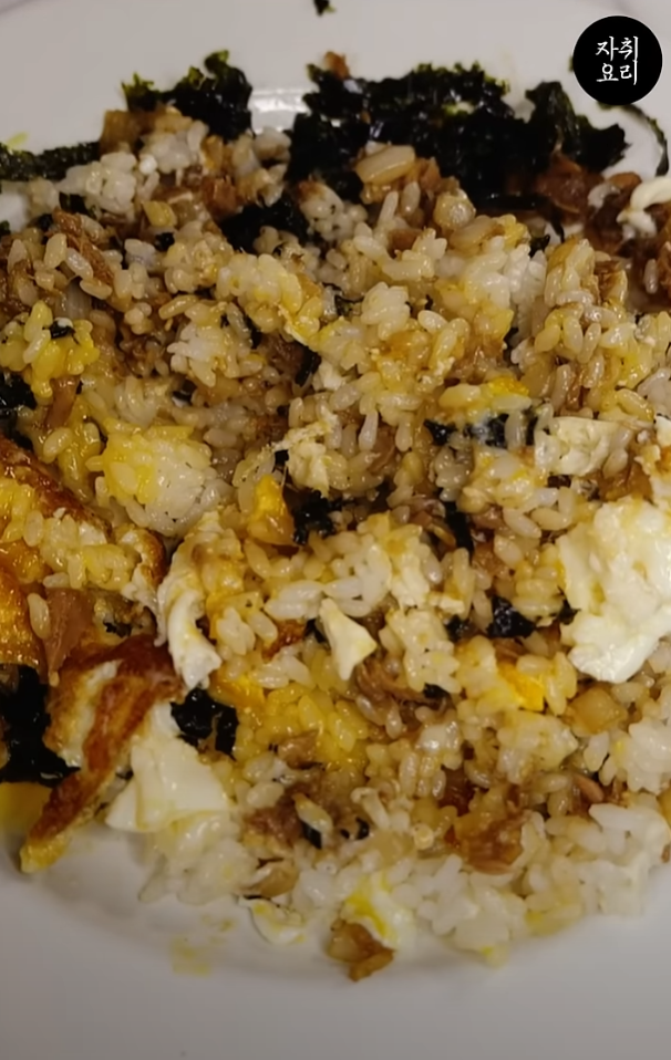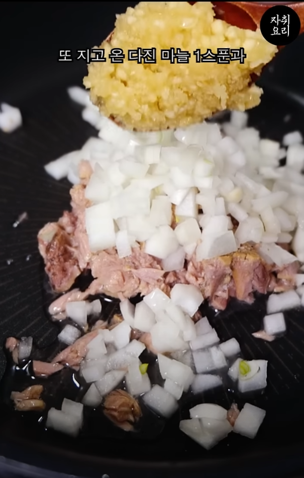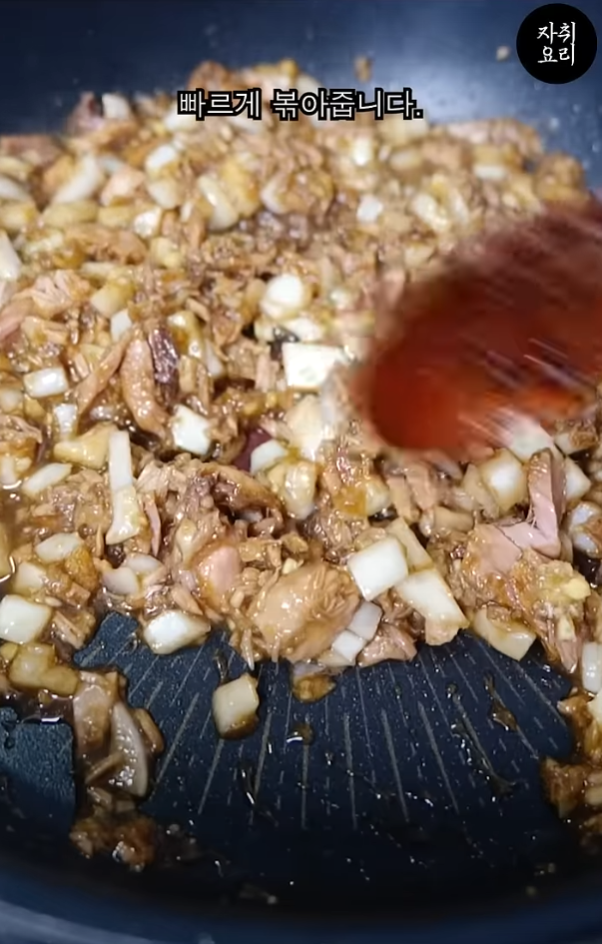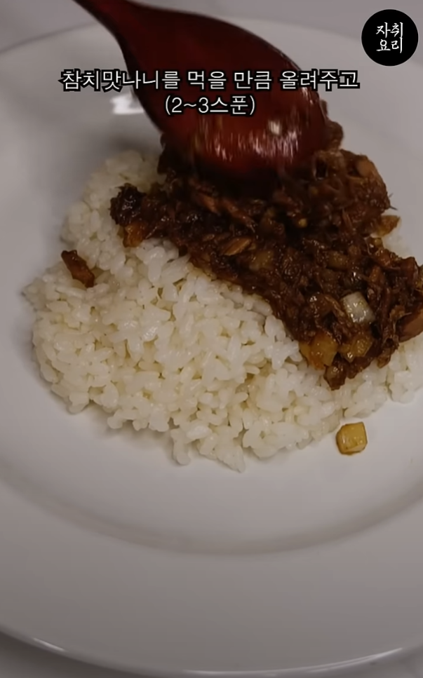 기름과 참치, 양파, 간장, 설탕을 활용해 풍부한 맛을 낼 수 있는 방법을 설명하며, 마무리로 계란 프라이를 얹어 완성하는 방법까지.