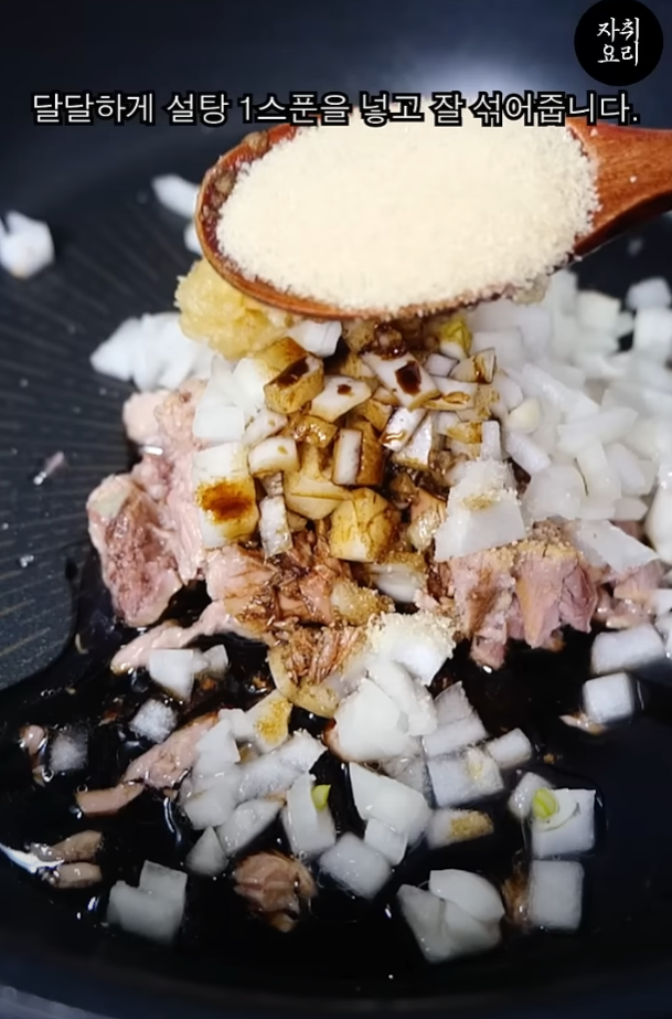 여기에 설탕 한 스푼과 진간장 3스푼을 넣고 섞는다. 설탕이 다 녹을 때까지 섞어야 한다.